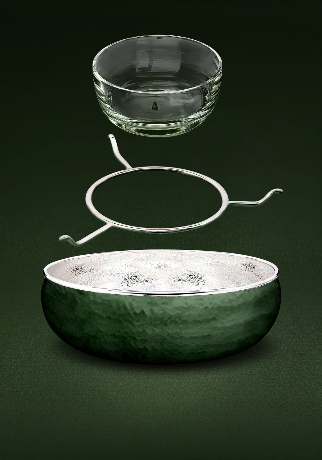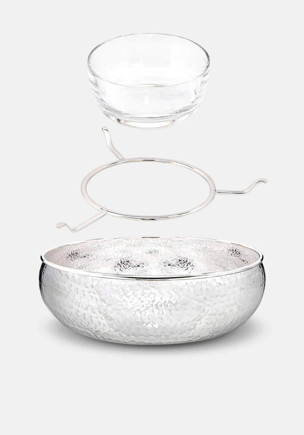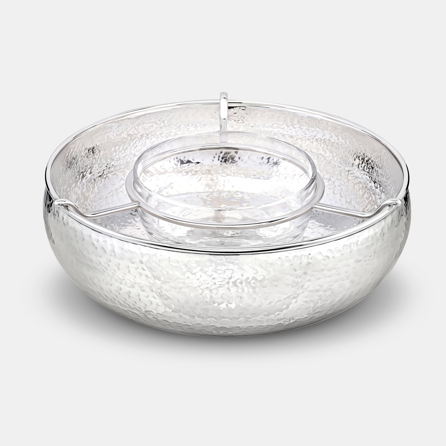 An elegant caviar bowl featuring a polished sterling silver base with a crystal insert. Designed to present and serve caviar with refinement, it brings a touch of luxury to any table setting.