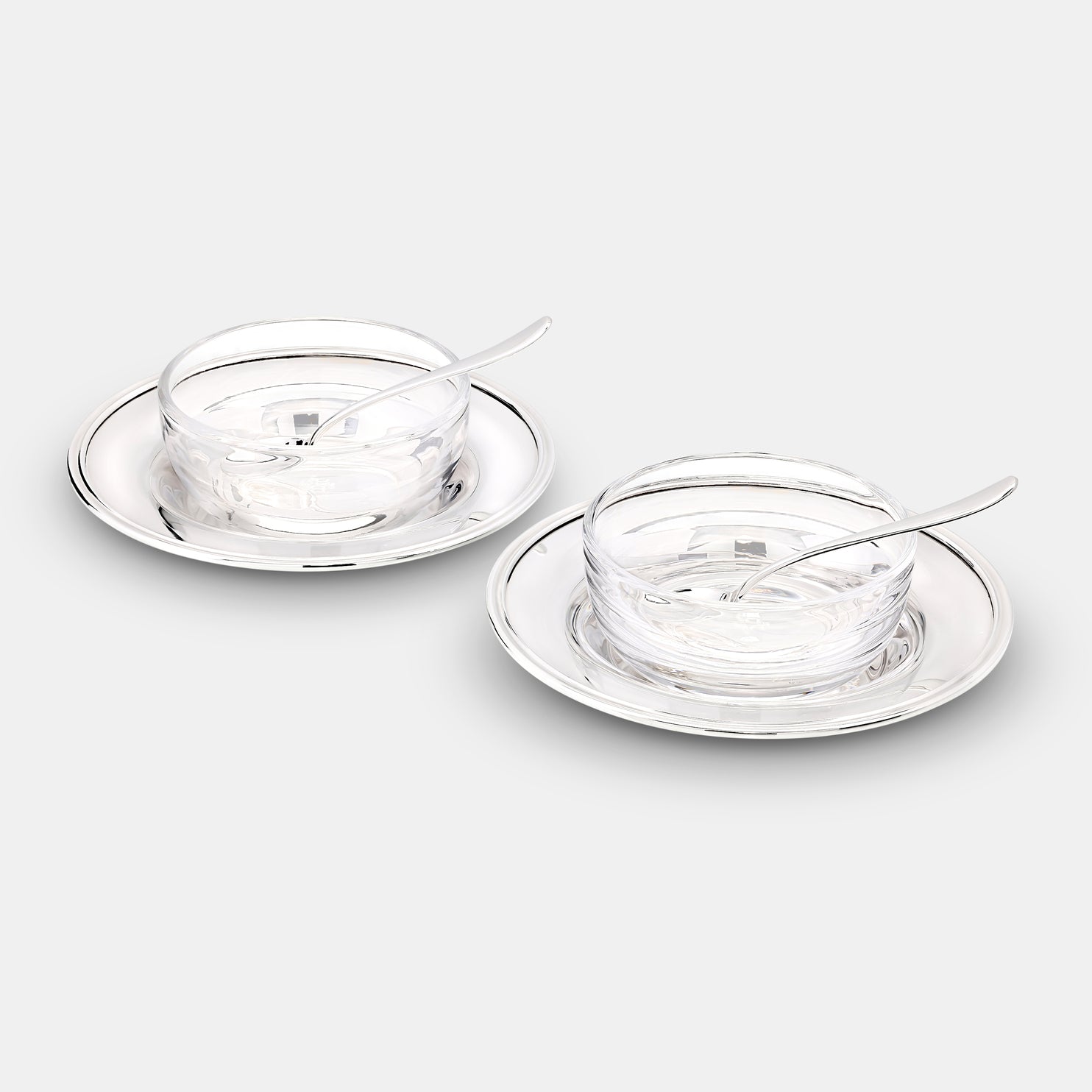A refined pair of cruet dishes designed for salt, pepper or condiments. Each set features a sterling silver plate with a plain crystal bowl and matching sterling silver spoon, combining clarity and brilliance in a timeless table accessory.
